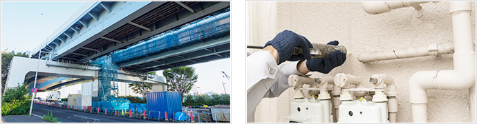 高速道路や鉄道の橋梁は、社会生活に必要不可欠なインフラとして人々の生活に密着しており、街と街、人と社会をつなぐ大切な役割を担っています。弊社は橋梁の新設工事・補修工事・耐震工事と携わっており、インフラを支えることで地域社会の発展に貢献しています。